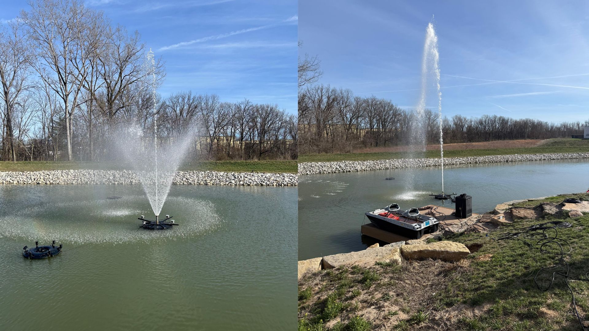 When selecting a fountain for a lake or pond, it’s important to take into account basic factors like size and depth. Floating fountains are ideal for deeper bodies of water since, as the name implies, they do not need to be anchored to the bottom. They can also be installed in lakes or ponds with sandy or muddy bottoms. Although not fixed in place, these fountains are secured with cables or similar devices that connect them to the pond’s bottom or shoreline. This setup ensures they remain stable and are not displaced by wind or water currents.